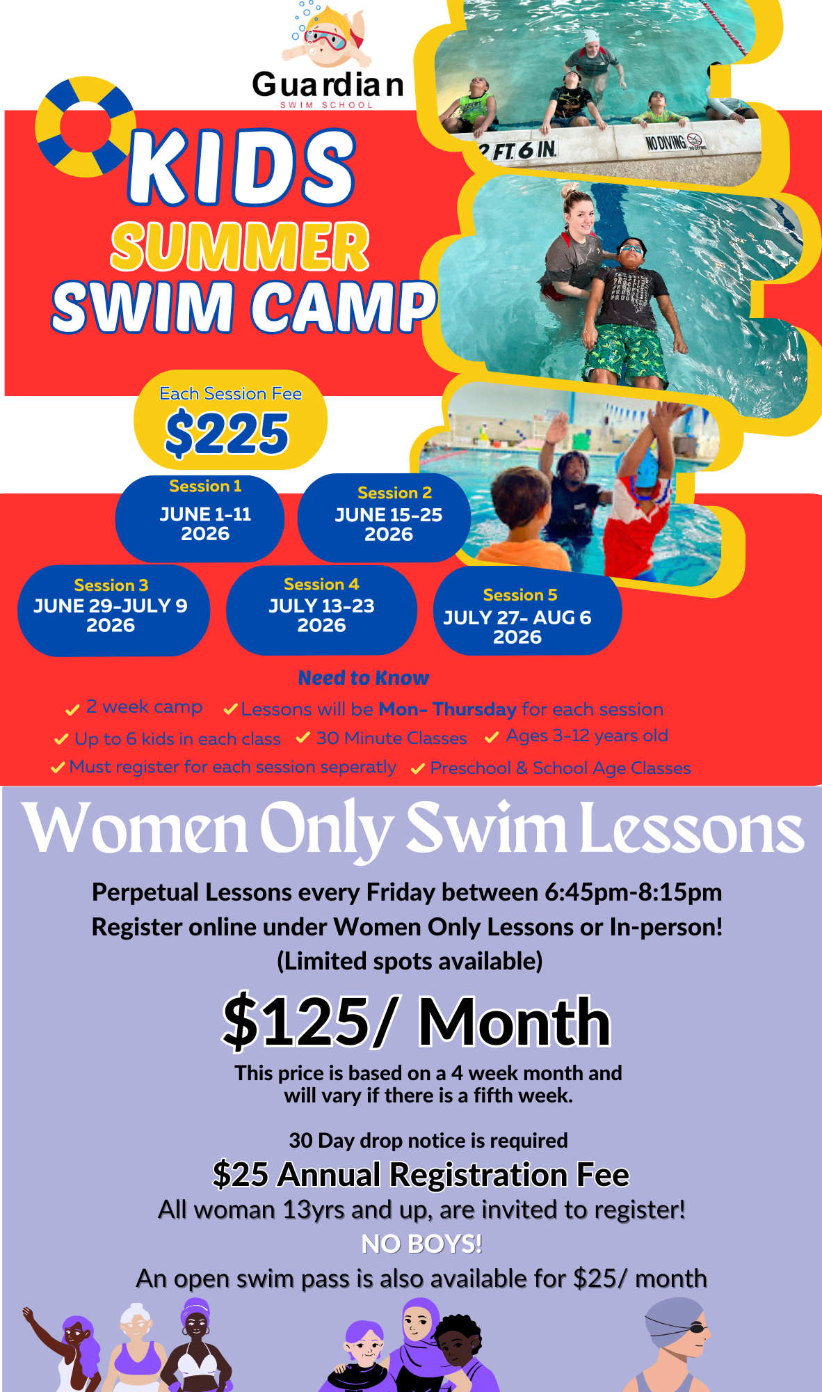 Operating & Swim Lesson Hours: Monday – Friday (2:00 PM – 8:00 PM); and Saturday (8:30 AM – 3:30 PM).